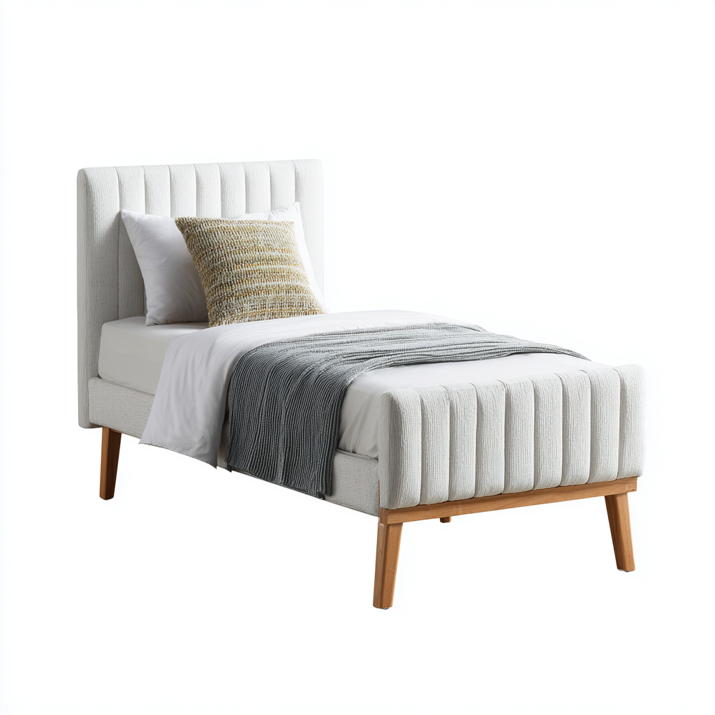 Letto singolo dal design equilibrato con testiera e giroletto imbottiti. Ideale per camere da letto moderne e ambienti residenziali che richiedono comfort visivo e funzionalita quotidiana.